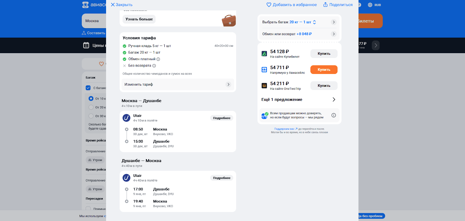 Выберите оптимальный, учитывая цену, длительность полета, условия провоза багажа и надежность авиакомпании.