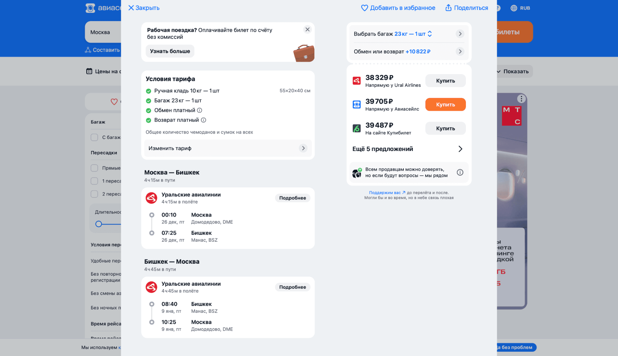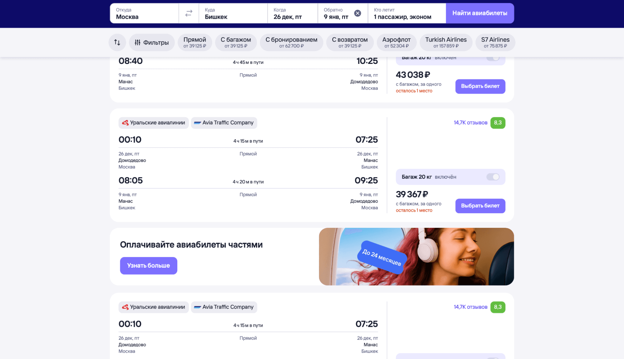 Время в пути: туда — 4 ч 15 мин, обратно — 4 ч 45 мин. Вылет из Москвы ночью (00:10), прибытие в Бишкек утром (07:25) — эффективно с точки зрения экономии дня.