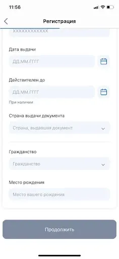 На следующем экране введите данные паспорта: серию, номер, страну получения, дату выдачи и окончание срока действия (при наличии). Укажите ваше гражданство и место рождения. Проверьте, чтобы сведения в документе и в приложении совпадали.