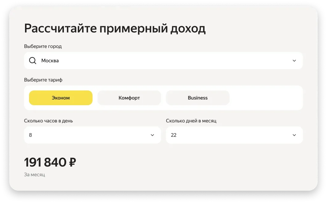 «Яндекс.Такси» предлагает примерный расчет заработка исходя из средних показателей. Если работать 22 дня в месяц по 8 часов, в Москве можно получать: