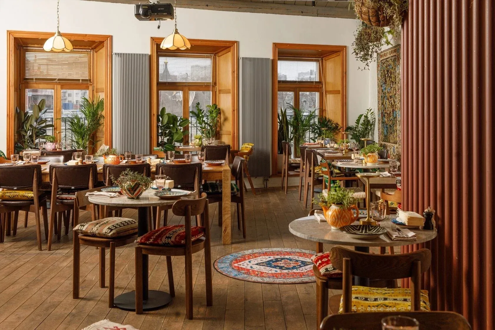 «Kilim» находится почти на берегу реки, с террасы открывается живописный вид на центр города и Храм Христа Спасителя. Внутри — уютный интерьер с восточными орнаментами и мягкими диванами.