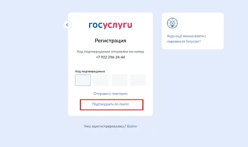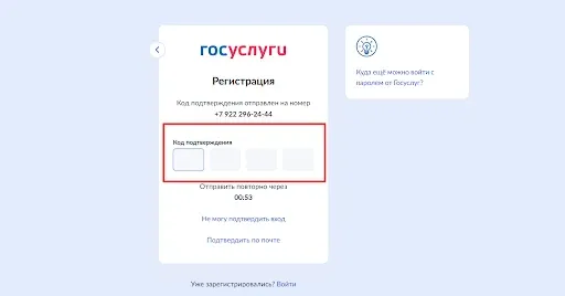 6.На ваш телефон придет СМС с кодом из четырех цифр. Введите их в окошке «Код подтверждения». Если сообщение не приходит, можно сделать повторный запрос через минуту.
