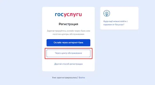 2.Выберите вариант регистрации «Через центр обслуживания».