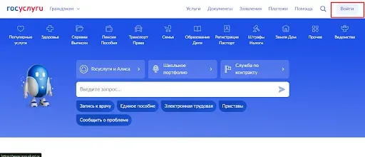 1.Зайдите на gosuslugi.ru. Нажмите на кнопку «Войти» в правом верхнем углу.